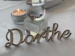 Vi designer dem, så bogstaverne hænger sammen og dobbeltnavne bliver forbundne elegant. Du kan også bede os om bordskilte (Bord 1, Bord 2 osv.). De kommer med fødder, så de kan stå op.