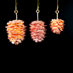 Ægte lærkekogler, der gennem en omstændelig proces på 5 dage bliver tørret, renset, forseglet og gjort elektrisk ledende med grafit, hvorefter de kan belægges med kobber gennem elektrolys. De får et tyndt lag usynlig lak til sidst, for at forhindre yderligere oxidering. Monteret med øje til ophængning (der medfølger en krog til juletræet).