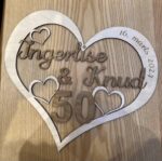 Skiltet vil være hjerteformet og teksten “svævende”. Teksten vil være mørkgraveret. Størrelsen er ca. 35×35 cm, men du kan bede om en mindre størrelse.
